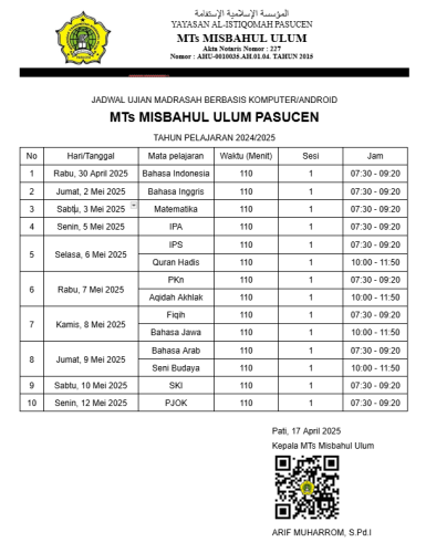 Kegiatan UM (Ujian Madrasah) Berbasis Komputer/Android di MTs Misbahul Ulum akan dilaksanakan mulai tanggal 30 April - 12 Mei 2025, Kegiatan ini dilaksanakan secara daring, siswa dapat mengakses melalui Aplikasi yang disediakan madrasah.